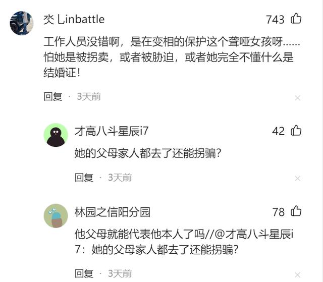 也有网友称,虽然女孩是聋哑人,但至少视力是正常的,双方也拍了婚纱照,只要拿着婚纱照给她看,然后看她的反应,是否自愿不是就很清楚了吗?